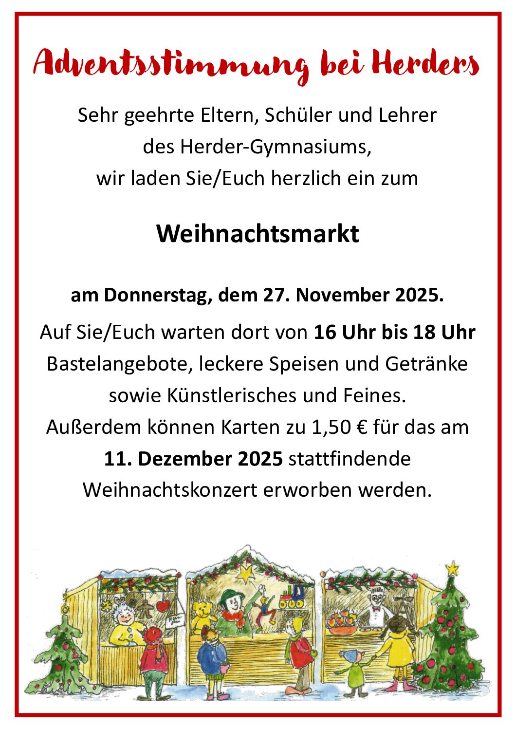 Am 27.11.2025 landen wir alle Schüler, Lehrer und Eltern ganz herzlich zum Weihnachtsmarkt ins Herdergymnasium ein.